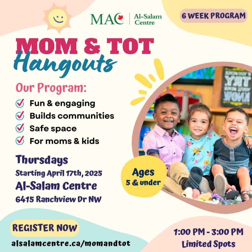 An engaging atmosphere for toddlers and moms full of fun activities and opportunities to learn and play in an Islamic environment. The Mom and Tot program resumes on November 13, 2025 and takes place every Thursday from 12:30 PM to 2:30 PM.